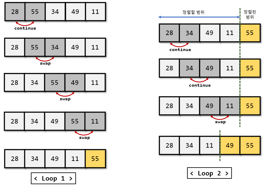 => 반복이 끝나면 정렬할 범위는 1 감소, 정렬된 범위는 1 증가한다.