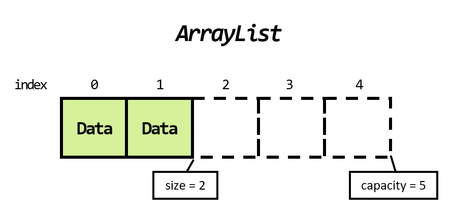자바에서 일반적인 배열을 선언할 때 int[] arr = {1, 2, 3}; 과 같이 선언하는데, 이 경우 코드는 간결하지만, 정적으로 메모리를 할당했기 때문에 배열의 크기가 고정되어 있다. 하지만 ArrayList는 동적으로 메모리를 할당한 배열로, 데이터를 추가하거나 삭제할 때마다 내부에서 배열의 크기를 조절한다. 일반 배열과 마찬가지로 인덱스를 통하여 데이터에 접근이 가능하다.