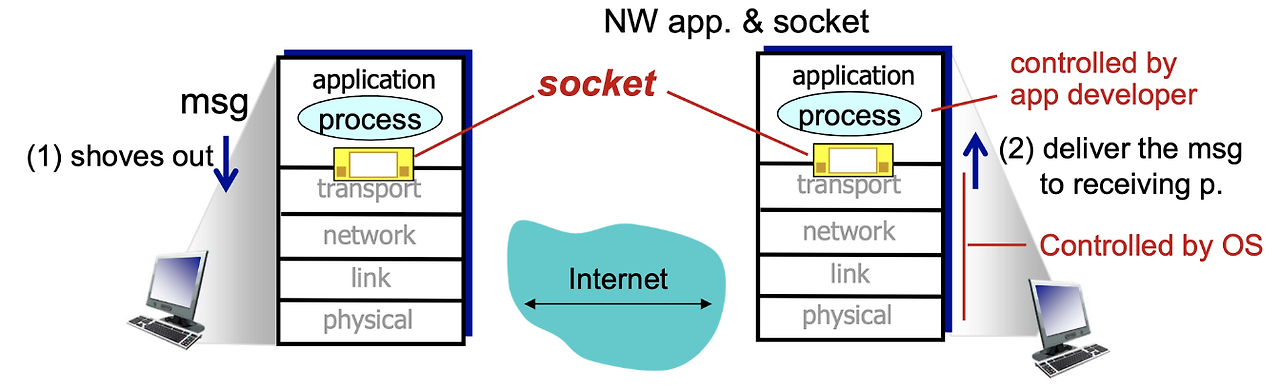 - a door between application layer and transport layer (소켓은 5계층과 4계층 사이의 문과 같다)