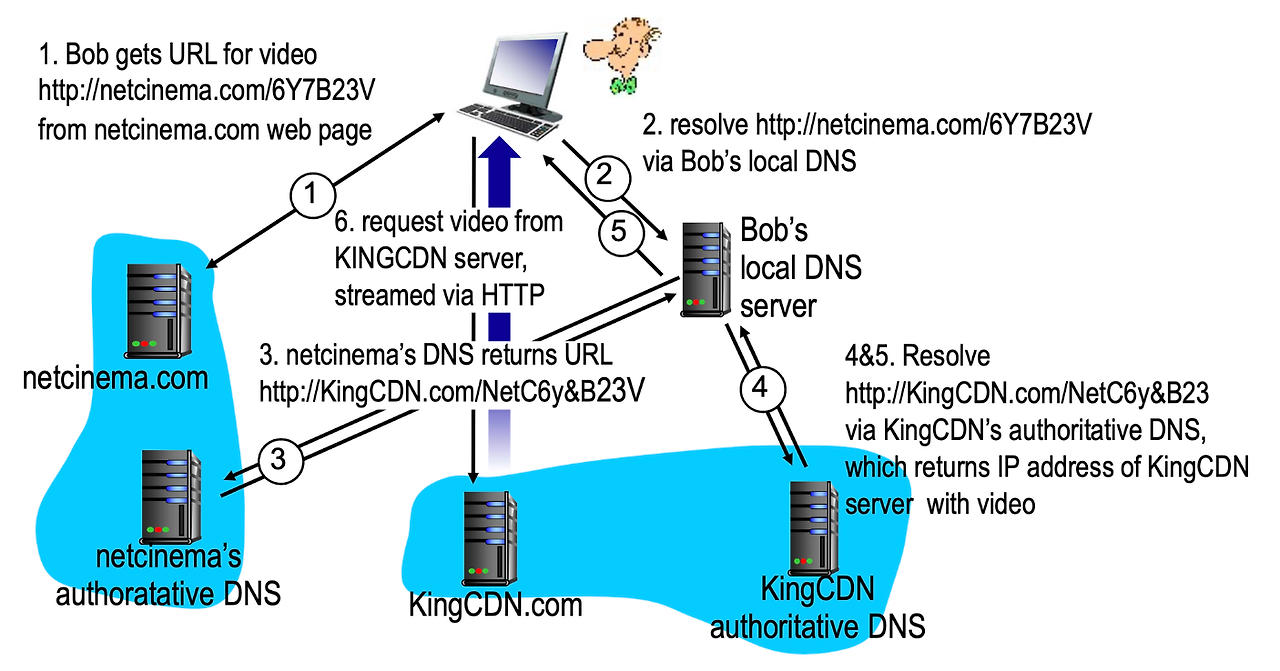 DNS를 이용해서 CDN에 저장되어 있는 server cluster를 찾아가는 걸 보여주는 예시이다.