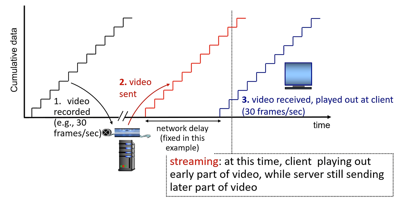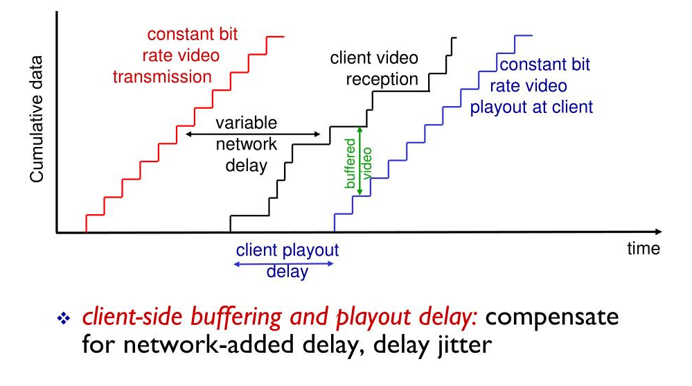 Server와 Client 사이에 congested Internet을 경유하게 될 때 발생하는 불규칙한 지연(delay jitter)으로 인해 client application은 buffering 이 필요함.