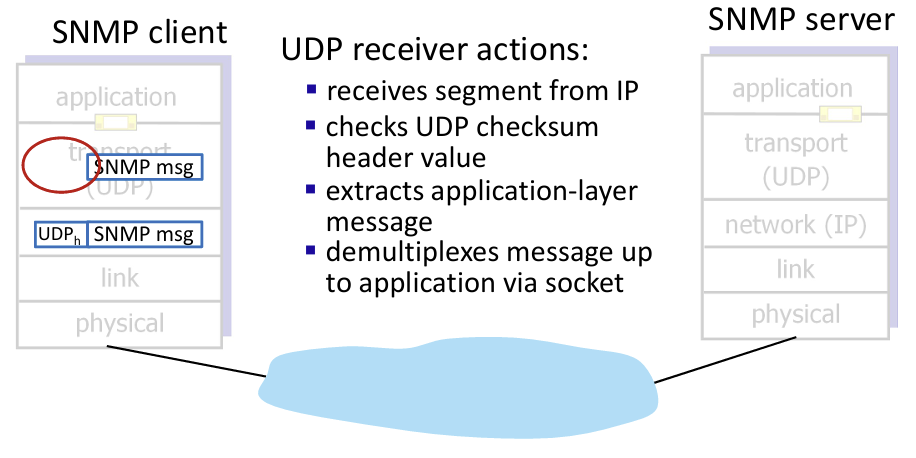 sender로부터 날아오면, network layer은 이 UDP segment를 Transport layer로 올려보낸다.