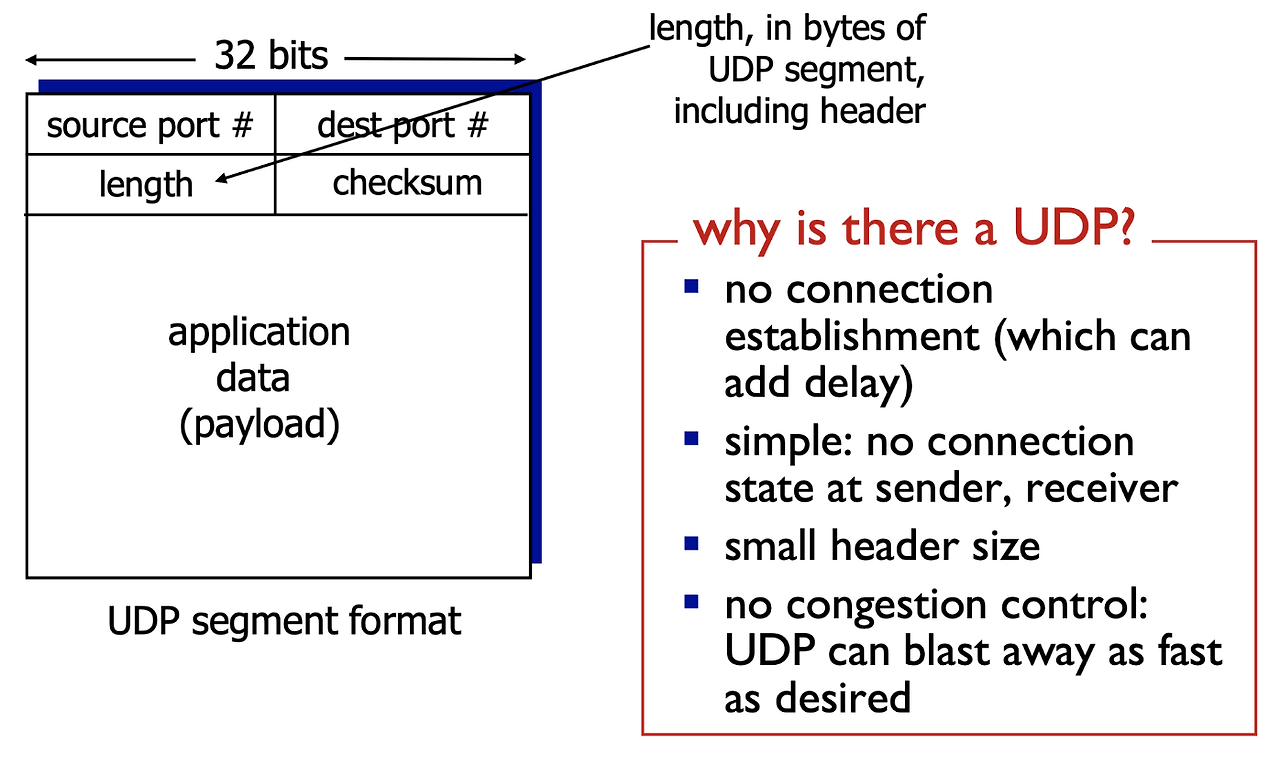 => 그 다음 checksum을 계산하고(16bit), UDP segment를 network layer로 내려보낸다.