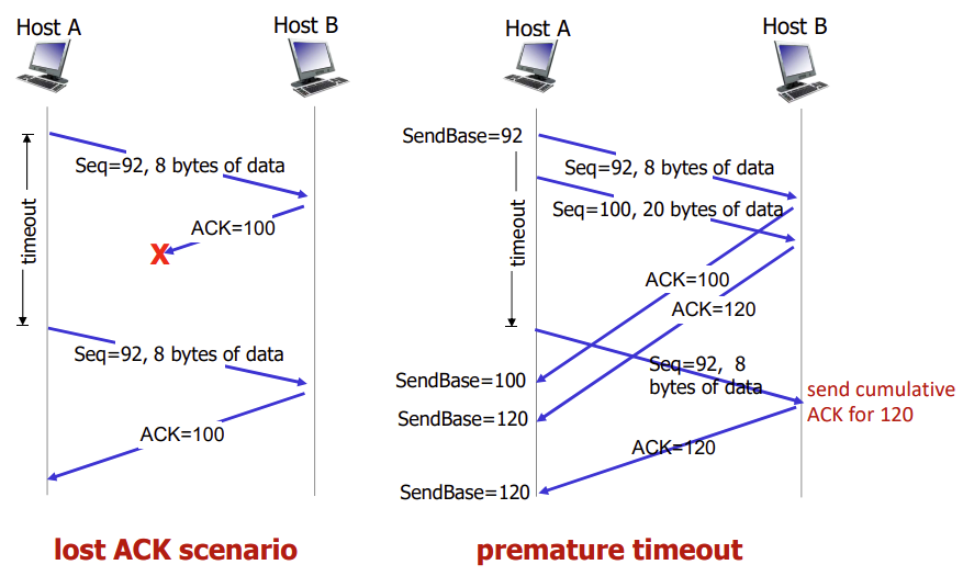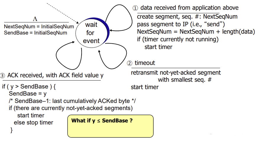 - timeout이 발생하면, timeout이 발생한 해당 segment를 재전송 후 timer restart