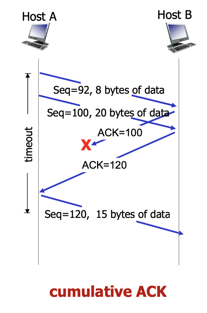 하지만, 못받은 첫번째 ACK은 신경쓰지 않는다. 왜냐하면 ACK = 120을 받았다는건, 119번째 byte까지는 B에게 잘 전송되었다는 의미이기 때문이다.