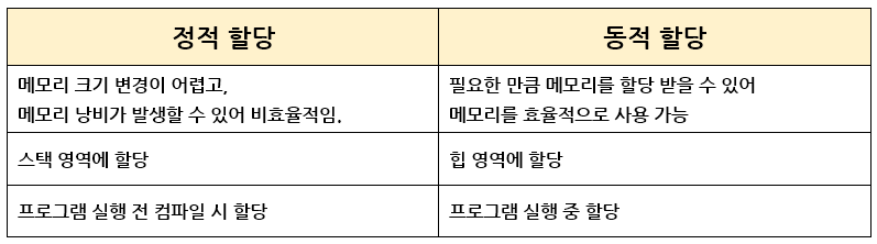 다른 방법으로는 동적 메모리 할당이 있다. 프로그램 실행 도중에 필요한 만큼의 메모리를 할당받고, 사용이 끝나면 메모리를 다시 반납하는 방식이다. 필요한 만큼만 할당받아 사용한 후 반납하기 때문에 메모리를 매우 효율적으로 사용할 수 있다는 장점이 있다.