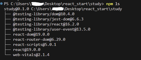 의존성 트리는 powerShell (터미널)에서 "npm ls" 명령어를 통해 조회 가능하다. 아래는 나의 프로젝트의 의존성 트리 내용이다.