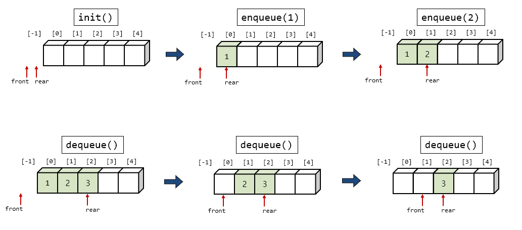 큐도 스택과 같이 1차원 배열로 구현이 가능하다. (물론 다른 방법도 존재하나 1차원 배열을 이용하는게 가장 간단하다.) 큐의 첫번째 요소를 가리키는 변수 front 와, 큐의 마지막 요소를 가리키는 변수 rear 을 설정한다. 스택이 비어있는 초기 상태에는 front와 rear이 모두 -1의 값을 가진다. 스택에 요소를 삽입할 때마다 rear은 1씩 커지고, 스택에서 삭제가 일어날 때마다 front도 1씩 커진다.
